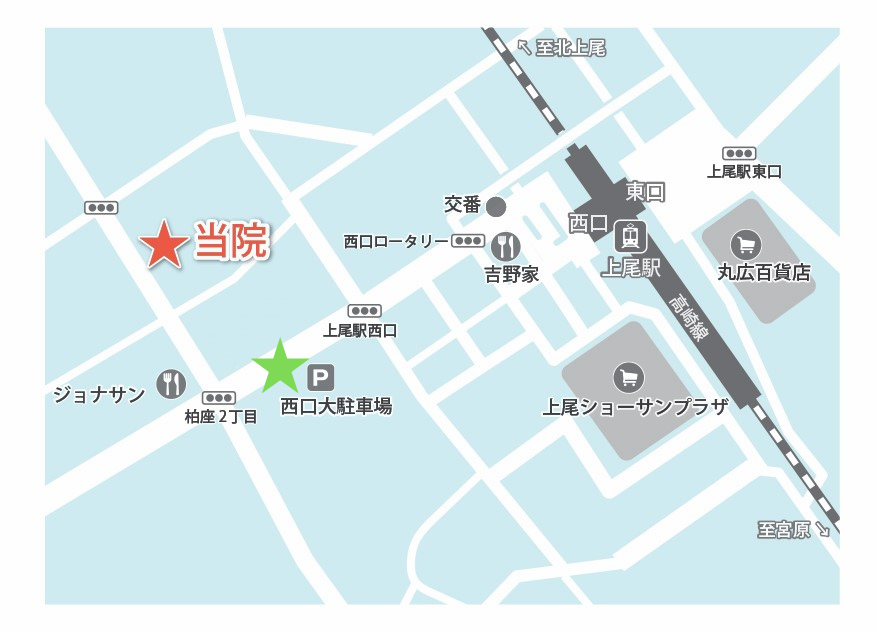 ※場合によりカーオアシス上尾 西口大駐車場をご案内する事があります。緑の★がカーオアシス上尾 西口大駐車場です。その際は駐車チケットをお渡しします。
